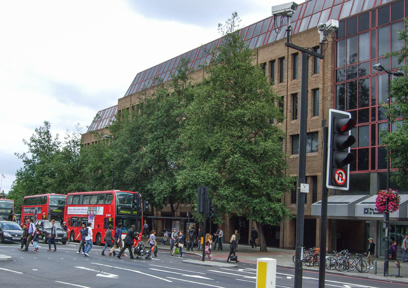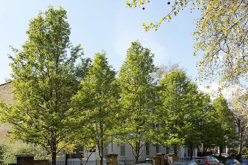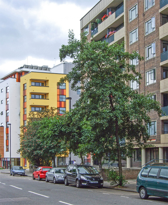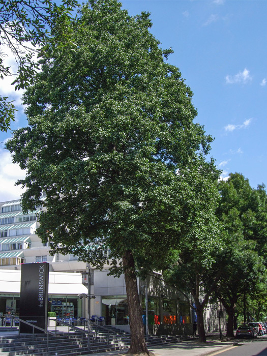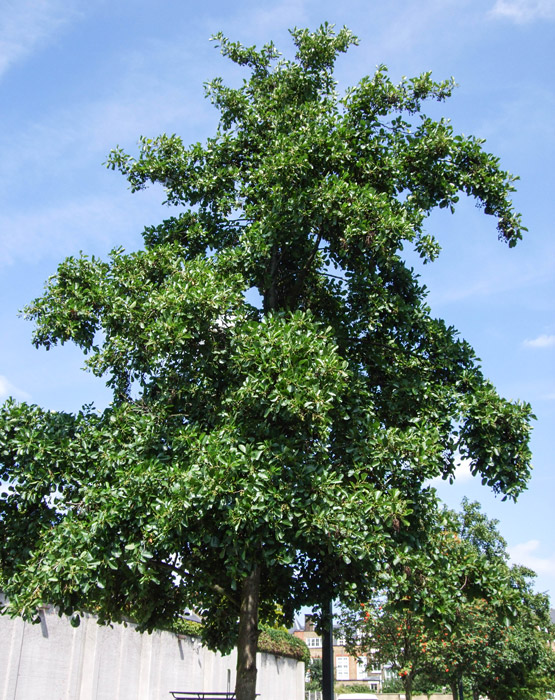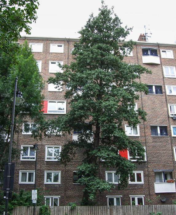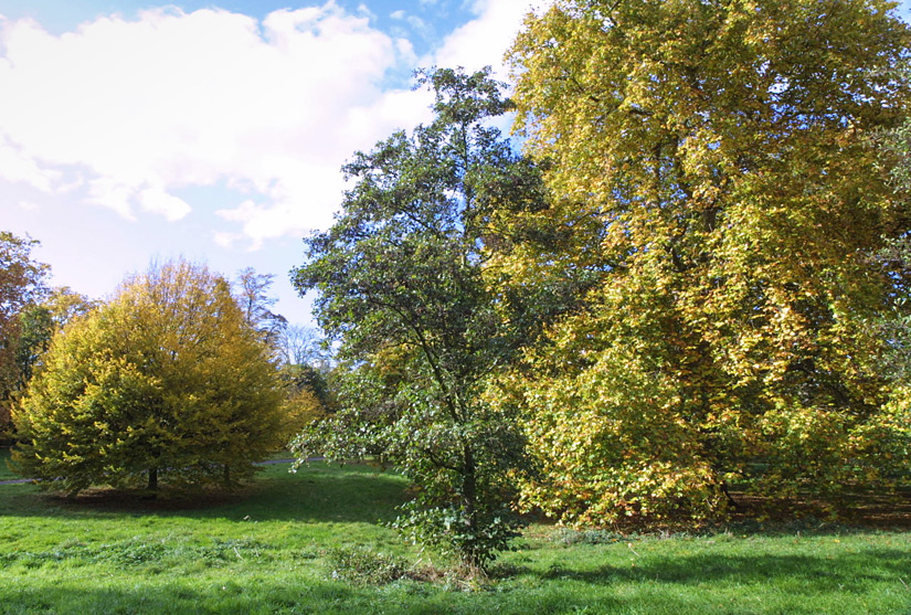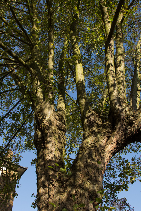 A mature, pollarded alder in early winter, still retaining many of its leaves.