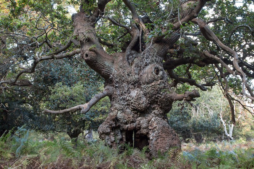 An ancient pollard oak, a huge cavity in its trunk.