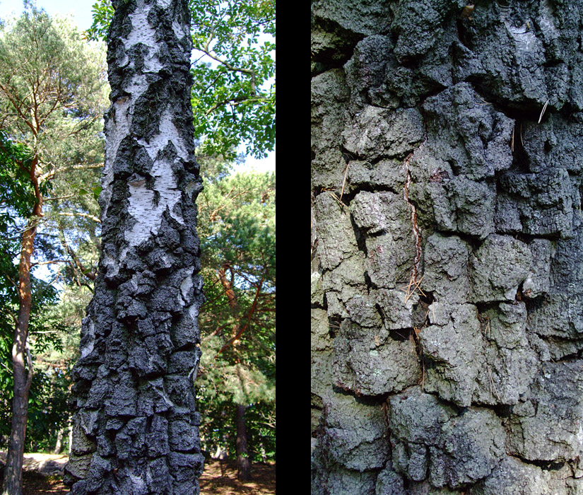 The bark of old birch trees looks more like coal than wood.