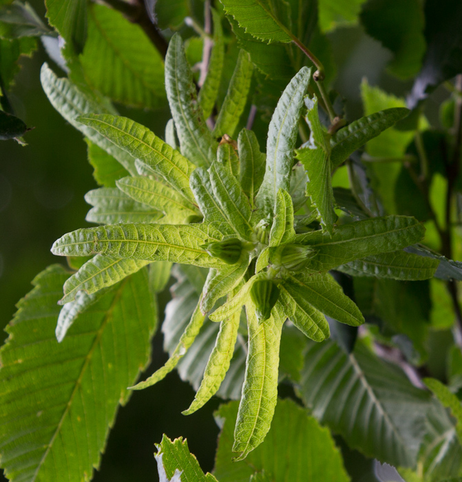Buds of the fastigiate hornbeam about to break into leaf.