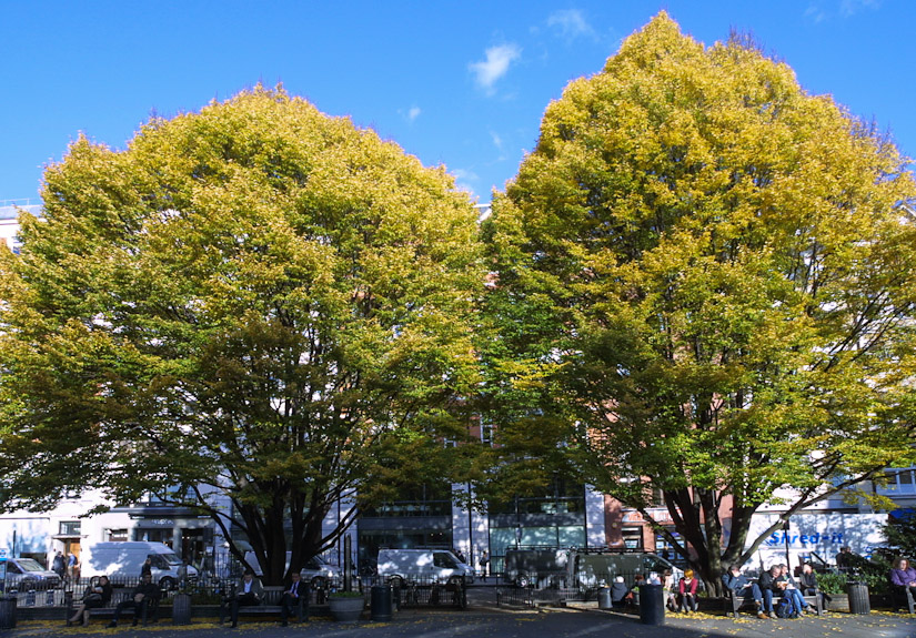 Two of of four resplendent fastigiate golden Hornbeams in Soho.