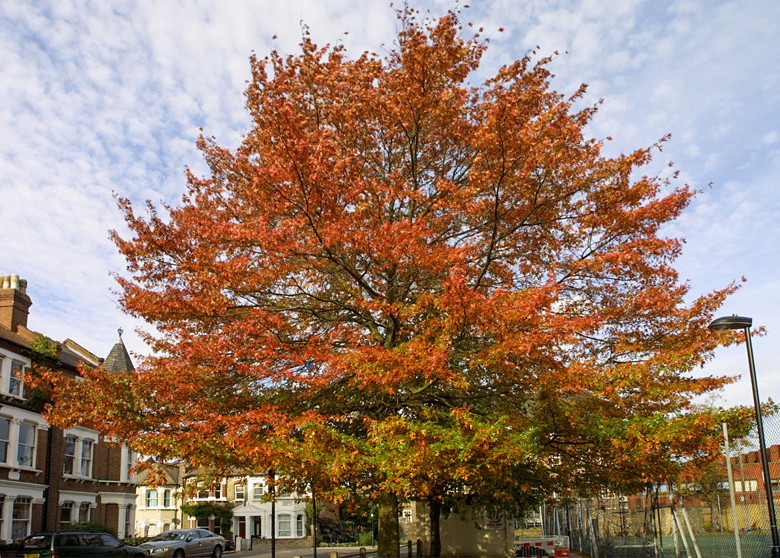 A young oak set beside a London plane, showing the difference in colours of the young leaves on a bright spring day.