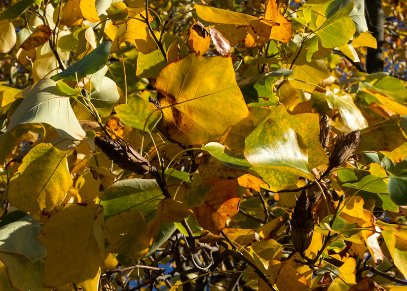 Brown seed pods and golden leaves of the Tulip tree at the end of the season.
