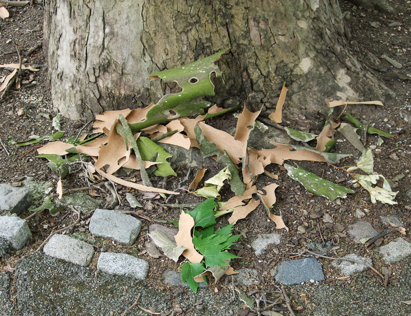 Plane bark, fallen from branches as they expanded.