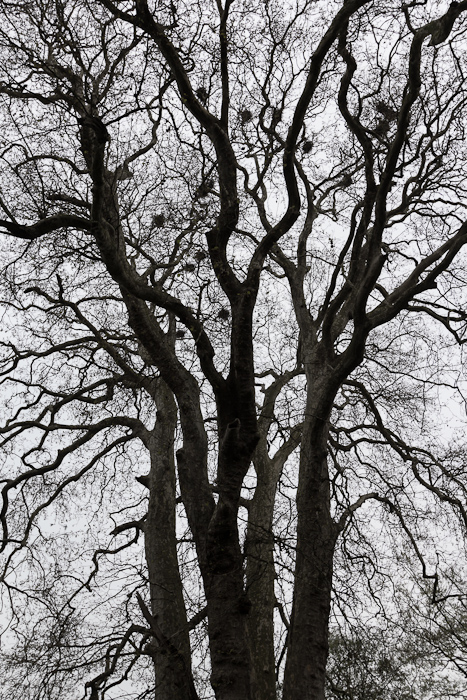 The central area of the larger London plane in winter, showing some of the many rooks’ nests among its branches.