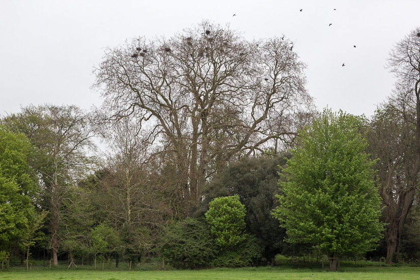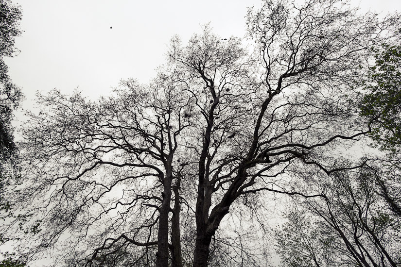 The vast crown of the larger London plane, seen at the end of winter, is host to a colony of rooks.