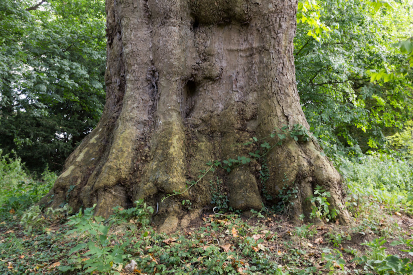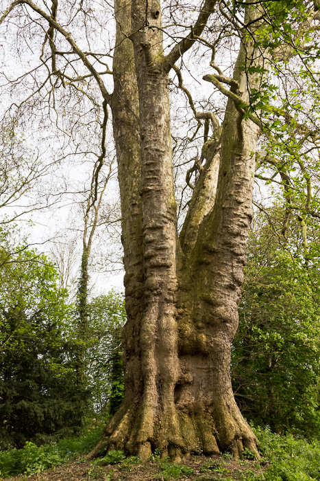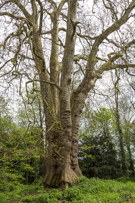 A first sight of the larger of two London plane trees planted around 1660-63 by the Bishop of Lincoln, growing in the wooded area of the grounds of the former Bishop's Palace at Buckden.