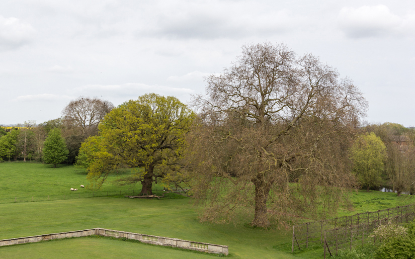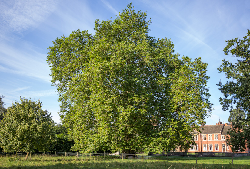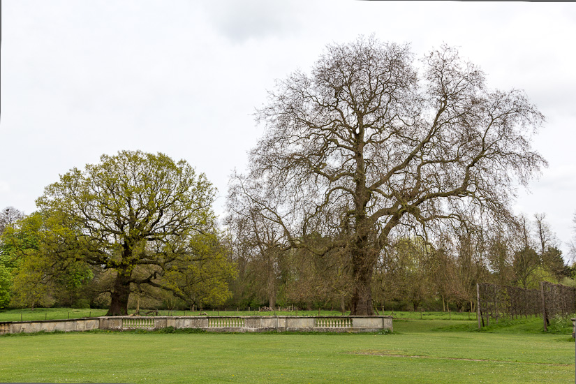 The larger plane is in the far distance. Between them is an oak tree coming into leaf, dating from c.1600.