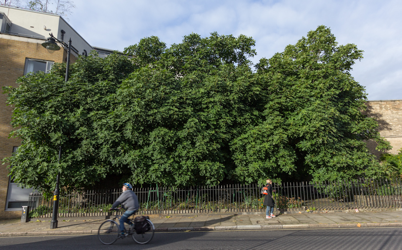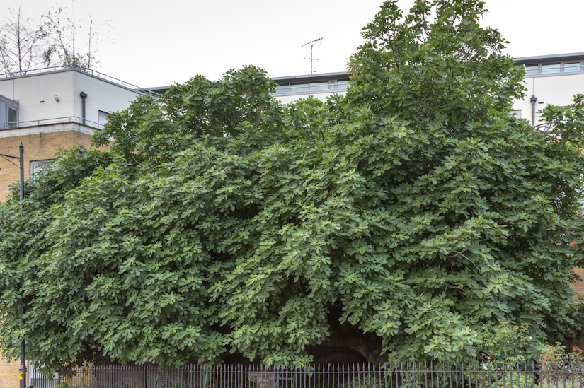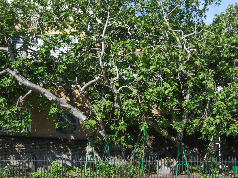 One of Islington’s notable trees, the Amwell Street Fig, Ficus carica; its branches are supported by several props.