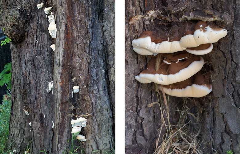 Both trees were showing fungal attack. These photographs show fungal development on one of the trees from mid-June to early July, 2012. Also showing in the left-hand photo is a rust coloured streak, the evidence of a bleeding canker that has become an increasingly common assailant of the species. It has a strong tendency to lead to the death of the tree over several tears. The canker was well-established before the emergence of the fungus.
