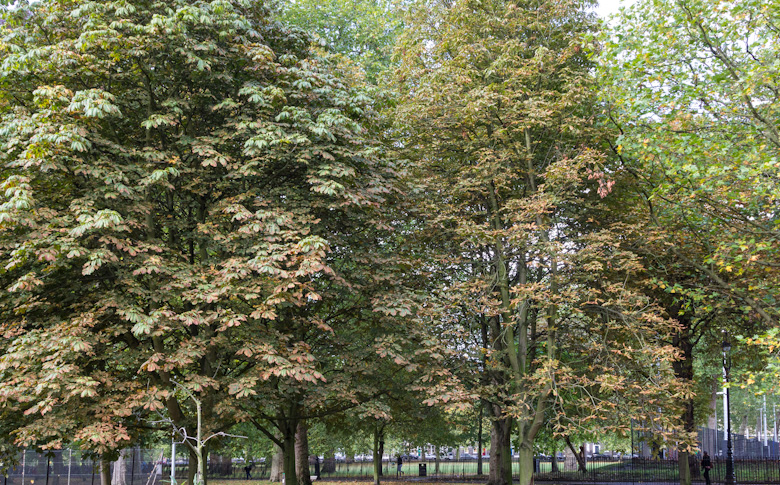 One of the effects of the camker is often a thinning of the crown of the tree, as seen in the horse chestnut on the right of the photograph. The browning of the leaves is a result of the pest Cameraria ohridella, the horse chestnut leaf miner, a moth whose caterpillars eat the flesh between the two surfaces of the leaves.