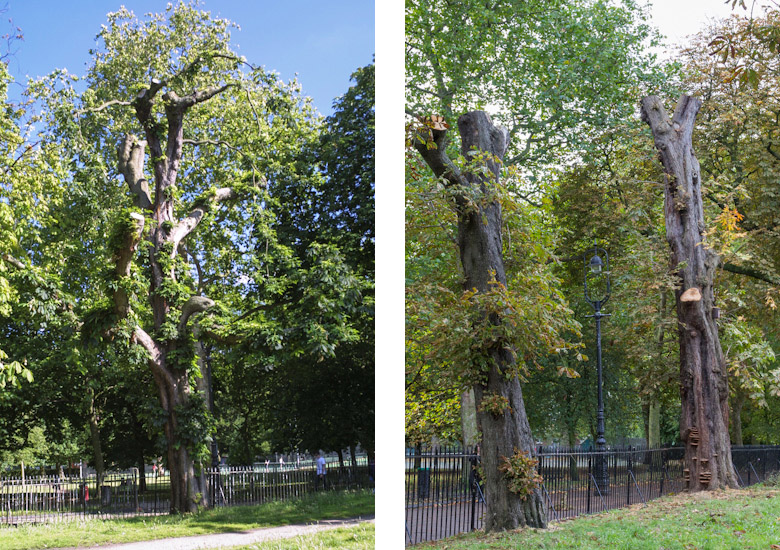 By 2008 the two trees had already been much reduced in size, left, and in October 2012 they have become tall, forlorn stumps.