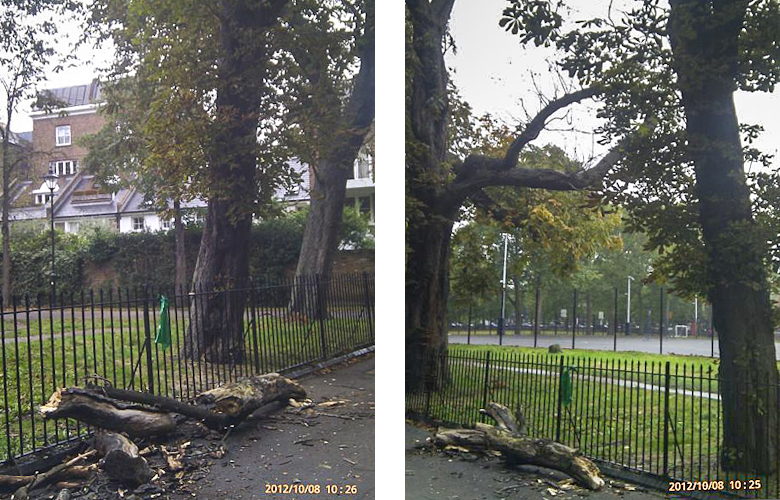 October 8th, 2012. A major branch lying on Church Path after its collapse. The two trees either side of the fallen branch had been in decline for several years. Photos courtesy of Islington Tree Service.