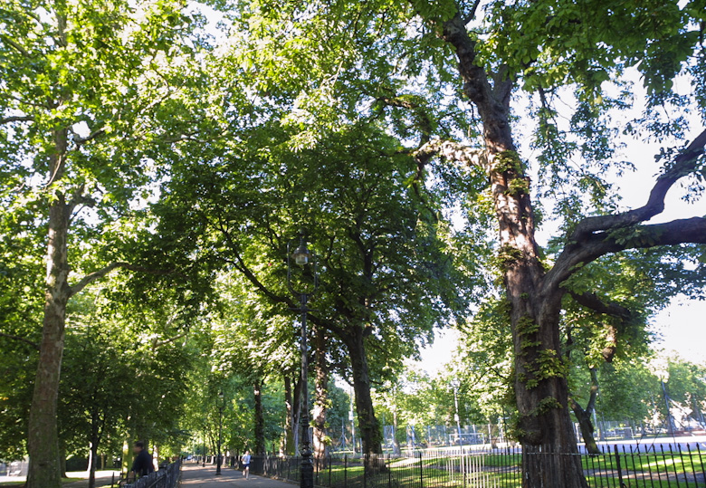 Five of the line of seven horse chestnuts along Church Path, Highbury Fields, in August 2007. The tree on the right can be seen in the right hand photo below.