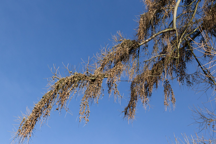 A branch of the European larch, Larix decidua, its old cones in profusion in winter.