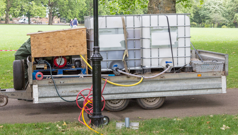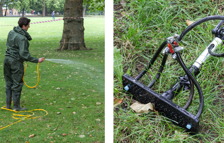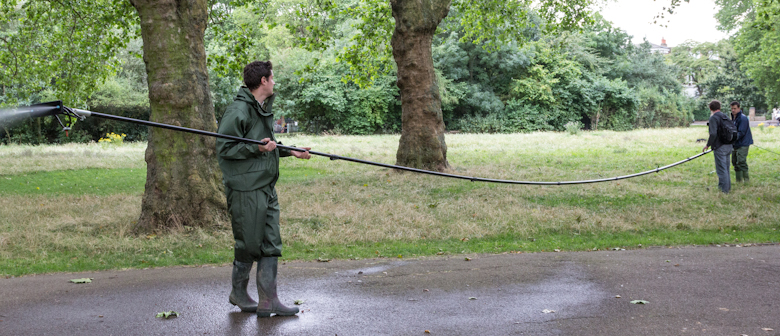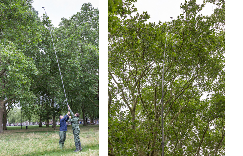 The enormously long, telescopic pole incorporates a small diameter tube from the pump sitting on a trailer forcing the fluid to the topmost branches of the trees. The fluid itself was a custom preparation by Laverstoke Park Laboratory based on composted material that was gently mixed with water to produce a ‘compost tea’, and aerated until the time of application so that the organisms it contained did not die before being released onto the trees.