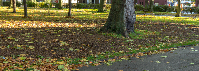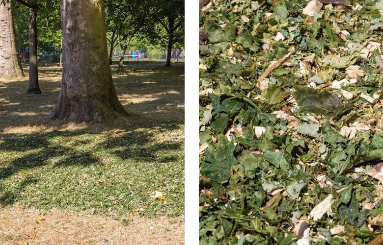 Three more London planes, this time in the Orchard area of Highbury Fields, were identified for the third test aimed at improving tree health against Massaria disease. A leaf, bark and wood chip mulch, to a depth of ten centimetres, (four inches), is designed to cover an area that extends from the stem of the trees for a distance of ten to twelve metres, (11-13 yards). This takes the area covered with mulch from a yard away from the trunk – to prevent potential infection of its bark – out to the drip line, the point at which rain drips onto the ground from the leaves at the edge of the crown. The mulch is prepared from the pruned branches of similar species of tree to a specification drawn up by Treework Environmental Practice.