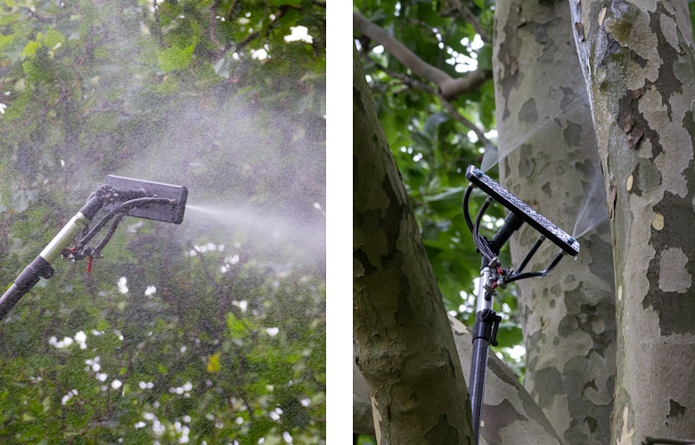 The branches and the telescopic pole sway in the wind as the spay head is manoeuvered through the canopies of the trees.