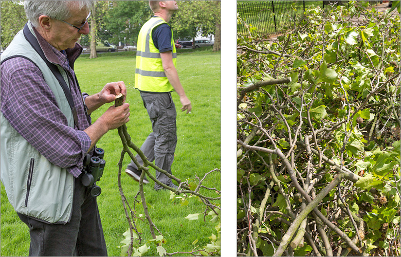 Neville Fay of Treework Environmental Practice inspects the first pruning for size and signs of Massaria. Piles of small-scale prunings soon amounted to a significant reduction in leaf cover and weight at the end of large branches. The object is to remove small pieces of branch from all over the outer edges of the crown of the tree to stimulate new growth and a healthier tree.
