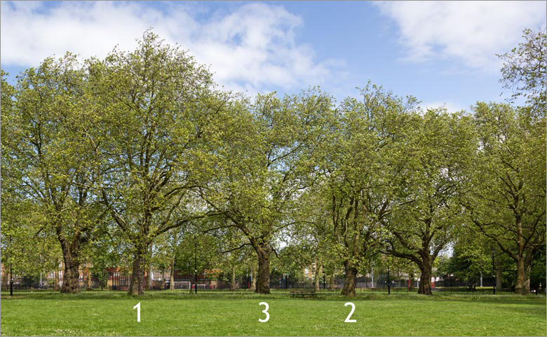 The three, pruned trees numbered in order of pruning. Unless you knew otherwise, it would hardly be possible to tell that any new tree work had taken place.
