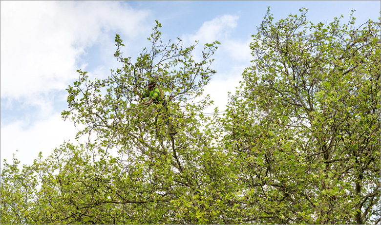 Pruning the finest branches at the top of the tree 20 metres above the ground. Fortunately, the wood of quite slender branches of plane trees is surprisingly springy and strong.