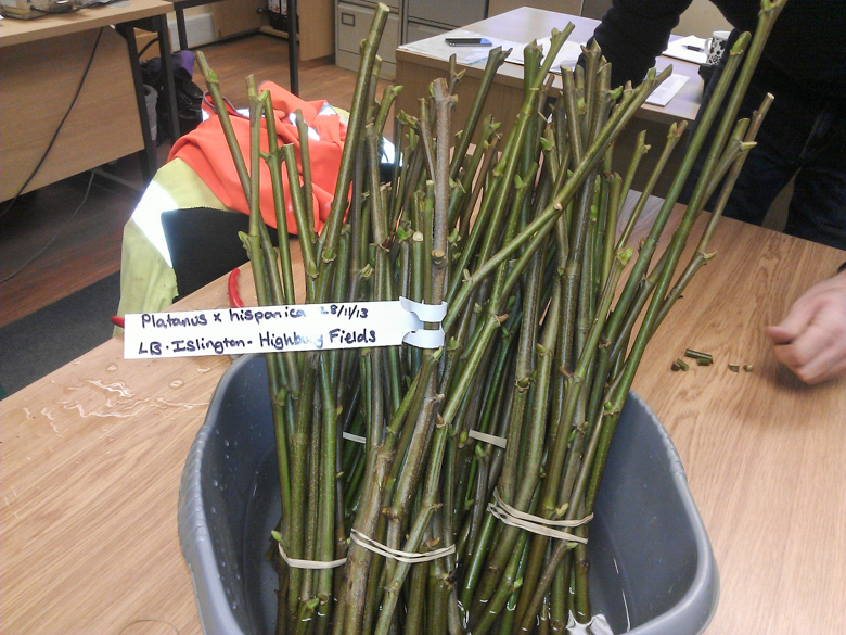For many years a great number of trees planted by local authorities in England have been sourced from nurseries in Holland. Information on where the Dutch came by the cuttings from which their trees were propagated is generally unavailable. In recent times, provenance has been becoming an issue, not least because of the global spread of pathogens and disease. Barcham Trees Ltd. has decided to propagate trees using cuttings from trees growing in this country. At the end of November, 2013, in association with Islington's Tree Service, Tom Wilson of Barcham Trees and his colleagues took a few hundred cuttings from London plane trees, Platanus x acerifolia, growing at Highbury Fields. The company is taking plane tree cuttings in other parts of London, too, in the expectation of having new London plane trees grown from London stock ready for planting in London’s streets and parks within 5-10 years, depending on the speed at which the tiny trees will grow.