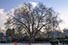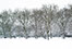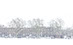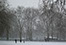 Lowry-like figures near an avenue of London plane trees in the snow, darkness falling.